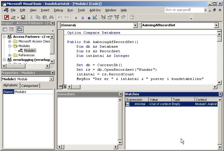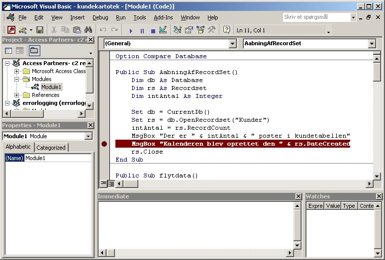 I VBA editoren findes en række værktøjer til at finde fejl i VBA kode. Den første og mest brugte er nok debug med F8. Har man en lidt større makro kan man afvikle makroen én linje af gangen ved at trykke F8.