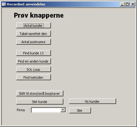 Sub SkiftTilStorebogstaver() Dim db As Database Dim rs As Recordset Dim store As Boolean Set db = CurrentDb Set rs = db.OpenRecordset("Kunder") store = (MsgBox("Skal der skiftes til store bogstaver (hvis du svarer nej skiftes til små)", vbYesNo) = vbYes) Do While Not rs.EOF rs.Edit If store Then rs("Firma") = UCase(rs("Firma")) Else rs("Firma") = LCase(rs("Firma")) End If rs.Update rs.MoveNext Loop rs.Close Set rs = Nothing Set db = Nothing End Sub Sub sletpost(Optional Kundenr) Dim db As Database Dim rs As Recordset Set db = CurrentDb Set rs = db.OpenRecordset("Kunder") If Kundenr = "" Then Kundenr = InputBox("Hvilken kunde skal slettes? ", "Slet kunde") If IsNumeric(Kundenr) Then rs.Index = "PrimaryKey" rs.Seek "=", Kundenr If rs.NoMatch Then MsgBox "Kunden blev ikke fundet" Else rs.Delete DoCmd.ShowAllRecords End If End If rs.Close Set rs = Nothing Set db = Nothing End Sub Private Sub cmdSlet_Click() sletpost cboKunder.Value End Sub Private Sub cmdSletKunde_Click() sletpost End Sub Private Sub cmdSQLLoop_Click() SQLList End Sub Private Sub cmdVisKunder_Click() DoCmd.OpenTable "Kunder" End Sub Brug for hjælp til VBA, VSTO eller SQL?