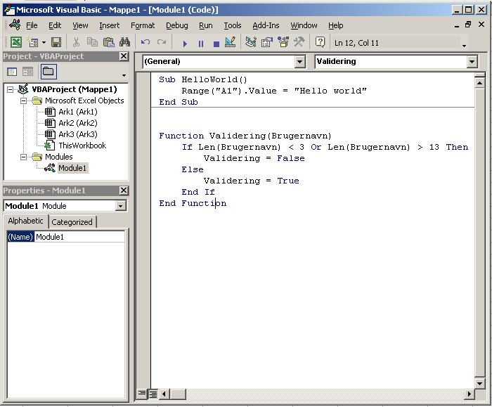 Sub HelloWorld() Range("A1").Value = "Hello World" End Sub Function Validering(Brugernavn) If Len(Brugernavn) < 3 Or Len(Brugernavn) > 13 Then Validering = False Else Validering = True End If End Function Sub SletA1() Range("A1").Clear End Sub Sub GulBaggrund() Range("A1").Interior.ColorIndex = 6 End Sub Sub HvidBaggrund() Range("A1").ClearFormats End Sub Husk, at du altid kan optage en lille makro, hvis du er i tvivl om hvordan man gør ét eller andet.
