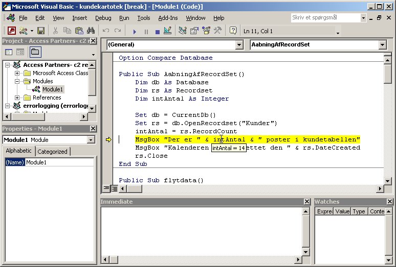 I VBA editoren findes en række værktøjer til at finde fejl i VBA kode. Den første og mest brugte er nok debug med F8. Har man en lidt større makro kan man afvikle makroen én linje af gangen ved at trykke F8.