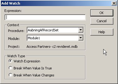 Vælger man View | Watch window i menuen dukker der et ekstra vindue op i bunden af skærmen, hvor man kan oprette overvågning på variable i makroen: