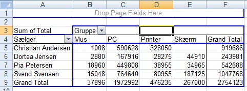Sheets.Add ActiveWorkbook.PivotCaches.Create(SourceType:=xlDatabase, SourceData:= _ "Salg!R1C1:R100C10", Version:=xlPivotTableVersion12).CreatePivotTable _ TableDestination:="Sheet1!R3C1", TableName:="PivotTable1", DefaultVersion _ :=xlPivotTableVersion10 Sheets("Sheet1").Select Cells(3, 1).Select With ActiveSheet.PivotTables("PivotTable1").PivotFields("Gruppe") .Orientation = xlColumnField .Position = 1 End With With ActiveSheet.PivotTables("PivotTable1").PivotFields("Sælger") .Orientation = xlRowField .Position = 1 End With ActiveSheet.PivotTables("PivotTable1").AddDataField ActiveSheet.PivotTables( _ "PivotTable1").PivotFields("Total"), "Sum of Total", xlSumKoden danner en ny arkfane til pivottabellen, tilføjer en PivotCache (kommer vi tilbage til PivotCache senere) og med CreatePivotTable dannes pivottabellen. Endelig sættes kolonne, rækker og sum på tabellen.