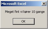 Sub SimpelBrugerdialog() MsgBox "Velkommen til min makro", , "Velkommen" Navn = InputBox("Hvad hedder du ", "Velkommen") Range("A1").Value = "Navn" Range("B1").Value = Navn svar = MsgBox("Skal vi gå i gang " & Navn & "?", vbYesNo, "Er du klar?") Range("A2").Value = "Start" Range("B2").Value = svar antal = InputBox("Du " & Navn & vbCrLf & "Hvor mange gange skal vi prøve?", "Er du frisk?", "10") Range("A3").Value = "Antal gange" Range("B3").Value = antal MsgBox "Meget fint, vi kører " & antal & " gange" End Sub Læg mærke til, hvordan man kan indsætte linjeskift i dialogen også.