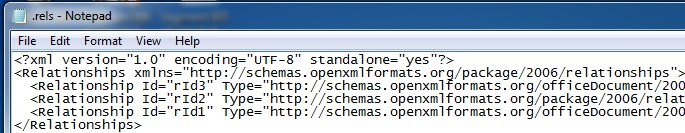 - Så langt så godt. Næste skridt er, at vi skal ned i mappen "_rels" og redigere filen ".rels". Den ser til at starte med sådan her ud